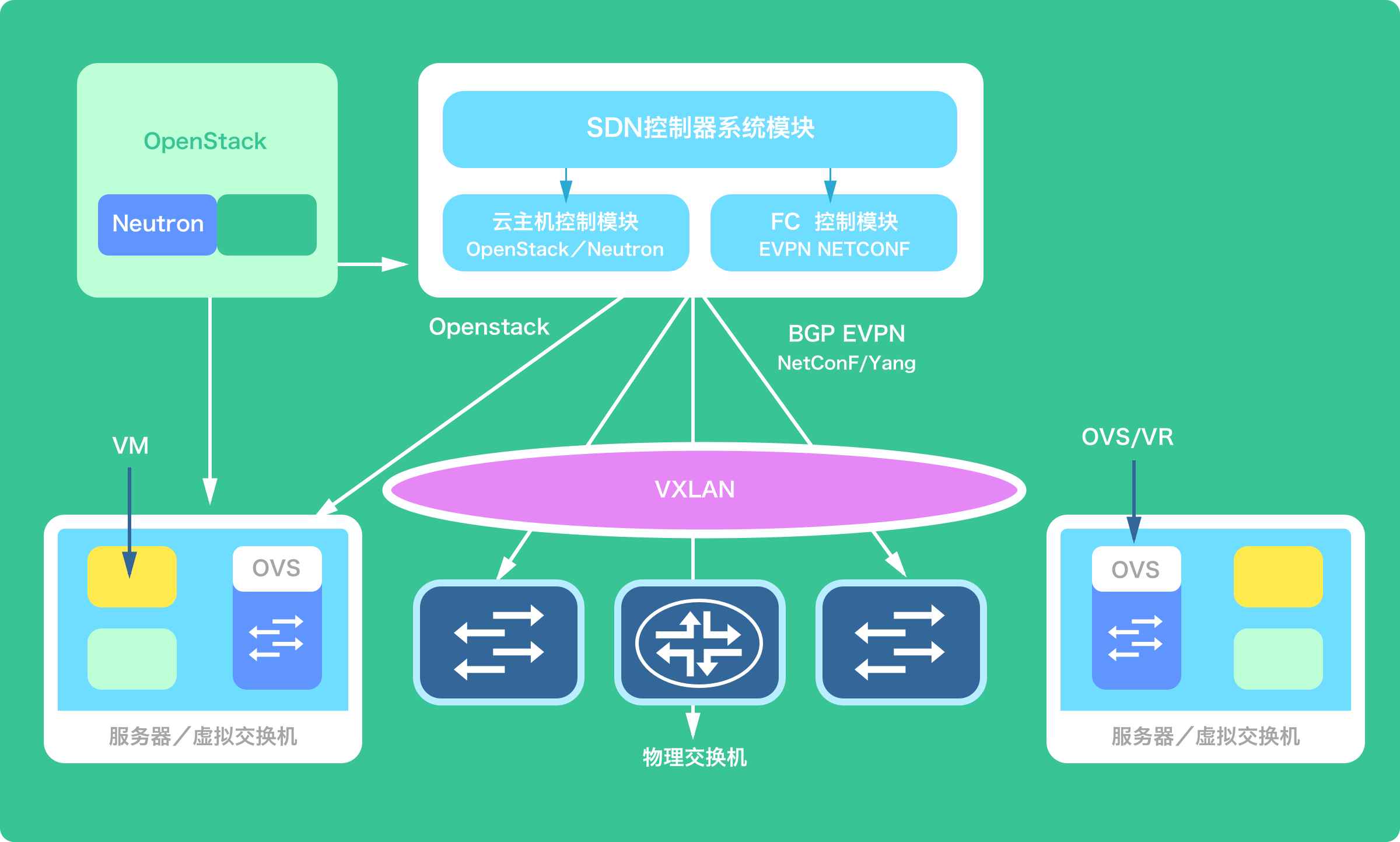 SDN-MSDC配合数据中心云计算的部署,基于ODL技术,解决数据中心内部与云管平台的网络编排器(如Neutron)的集成和对接,实现云网一体化控制和管理;另一方面为了满足数据中心大二层的需求,通过南向接口NETCONF/YANG/NXAPI部署实现VXLAN快速部署,连通主机和硬件交换机之间OverLay网络。